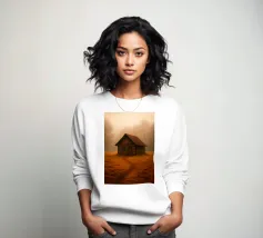 Una casa rustica in legno si erge tra erbe alte e alberi senza foglie, creando un'atmosfera tranquilla in un'area rurale. La scena evoca un senso di tranquillità e solitudine.