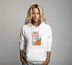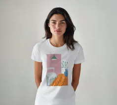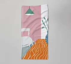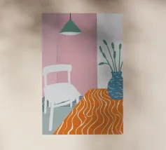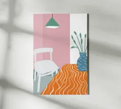 Una scena d'interni serena e minimalista è caratterizzata da un semplice tavolo, una sedia e una pianta in vaso su uno sfondo di rosa tenue e bianco, che crea un forte senso di calma e contemplazione.