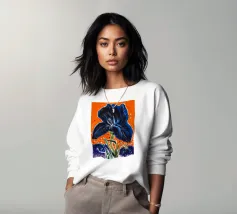 Una rappresentazione dettagliata e vibrante di un singolo fiore di iris in piena fioritura, che mostra i suoi intricati petali nei toni del blu, del viola, del bianco e del giallo. L'attenzione si concentra sulla maestosa bellezza del fiore.