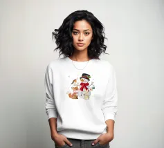 Un allegro pupazzo di neve e un omino di pan di zenzero si trovano accanto a una grande scritta rossa "JOY" ornata da fiocchi di neve e circondata da decorazioni natalizie. Scatole regalo e ornamenti festosi completano il tema stagionale.