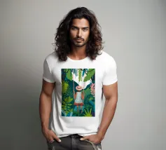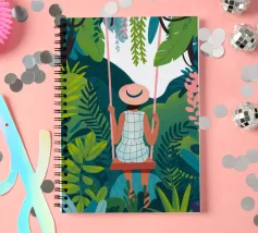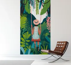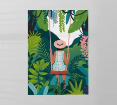 Una persona è seduta su un'altalena in mezzo a piante e fogliame verde. Il loro spirito giocoso è esaltato da un abito a scacchi e da un cappello a tesa larga, che sottolineano l'avventura.