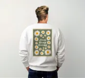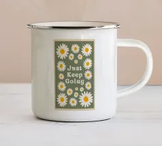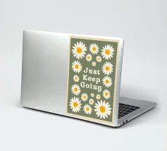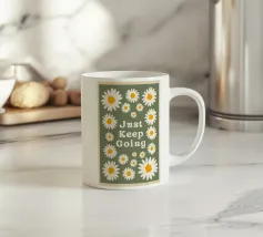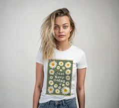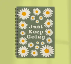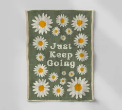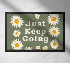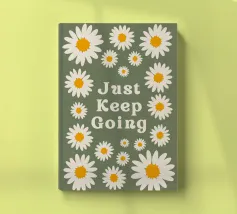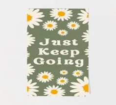 Stampa artistica motivazionale edificante e retrò con la frase "Just Keep Going" circondata da incantevoli margherite bianche e gialle. Lo sfondo verde salvia scuro e la texture rovinata le conferiscono un'estetica vintage anni '70. Perfetta per un dormitorio, un ufficio o una camera da letto.