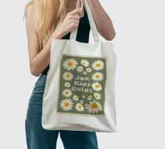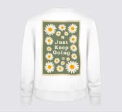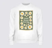 Arte floreale retrò, Just Keep Going, poster estetico anni '70, arte da parete con margherite, stampa motivazionale groovy, deco verde salvia, atmosfera hippie vintage, citazione ispirata