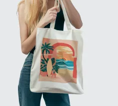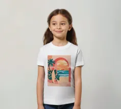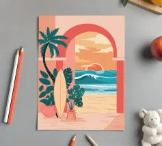 Una splendida scena di spiaggia con l'oceano calmo e il sole al tramonto, vista attraverso un arco color terracotta circondato da piante rigogliose. L'immagine crea la sensazione di entrare in un paradiso tranquillo e idilliaco.