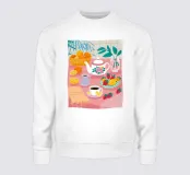 Una natura morta allegra e colorata di una scena di tè, con una teiera, tazze, arance e pasticcini su un tavolo rosa. Lo stile giocoso e i colori vivaci creano una sensazione di calore e felicità.