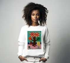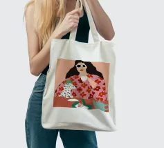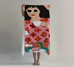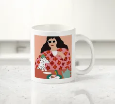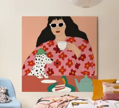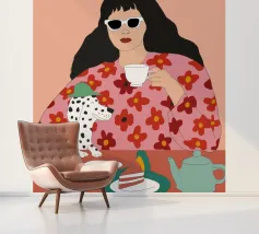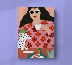 Un'elegante illustrazione di una donna con capelli scuri e occhiali da sole, che indossa un top a motivi floreali, che prende il tè con un cane dalmata che appoggia la testa sulle sue ginocchia, trasmettendo un momento di relax chic.