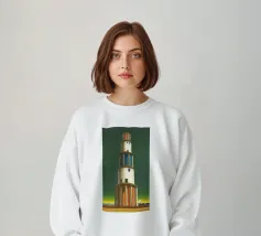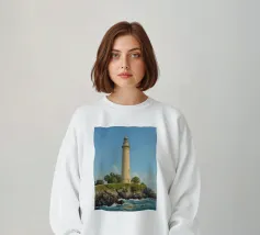 Un uomo guarda dalla finestra superiore di un semplice faro bianco contro un cielo azzurro e limpido, evocando i temi della solitudine, della vigilanza e del mare.