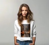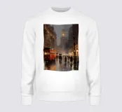 Questo dipinto d'atmosfera mostra una strada cittadina affollata sotto la pioggia della sera d'inverno. I tram storici, gli alberi decorati a festa e le luci calde si riflettono sul marciapiede bagnato. Persone in cappotto si affrettano a passare mentre l'orologio della torre accompagna la magia del periodo natalizio. Una scena piena di nostalgia, eleganza e atmosfera festosa.