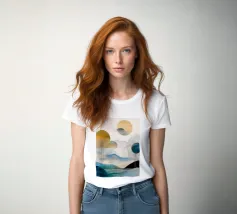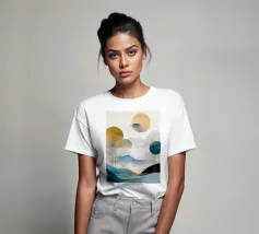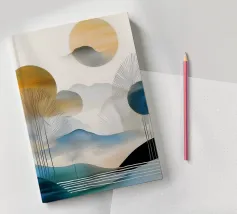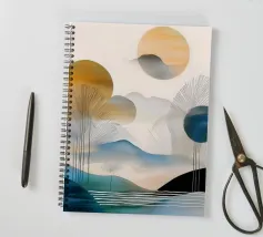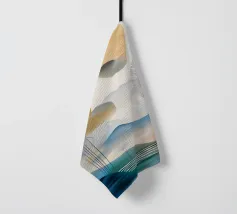 Un moderno paesaggio astratto caratterizzato da morbide tonalità terrose di beige, oro tenue e blu profondo, accentuate da delicate sfumature di blu. Le texture fluide e le linee sottili simili a quelle degli alberi aggiungono profondità e movimento, mentre le forme stratificate evocano un'estetica serena e senza tempo. Questo design minimalista è ideale per interni contemporanei o per spazi ispirati alla natura.