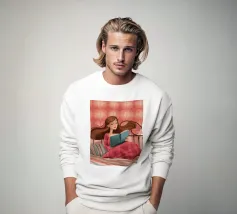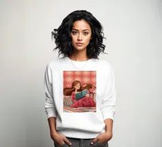 Illustrazione di una donna che legge un libro a letto, con un gatto che dorme pacificamente al suo fianco. La scena è un'immagine toccante, accogliente e serena di una compagnia perfetta e tranquilla.
