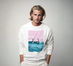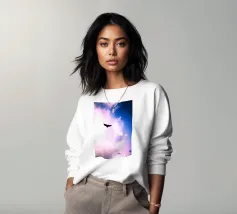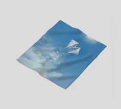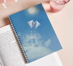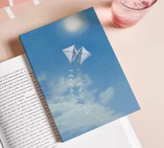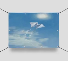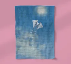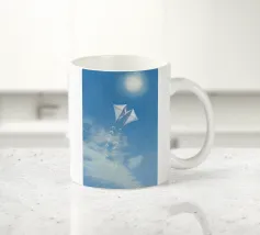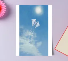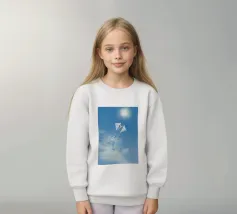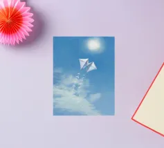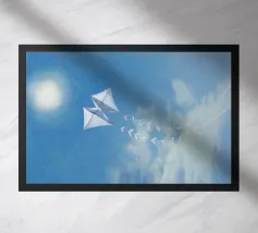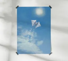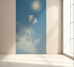 Un'illustrazione sognante e piena di luce di due aquiloni bianchi che si librano in un cielo azzurro, con delicate code di nastro che scivolano vicino al sole splendente. Con una texture pastello e una tavolozza pacifica, quest'opera d'arte cattura l'essenza della libertà, della nostalgia e della gioia tranquilla. Perfetto per asili nido, spazi ariosi e per chiunque sia attratto da scene di serenità edificanti e minimaliste.