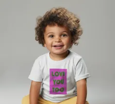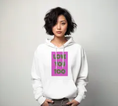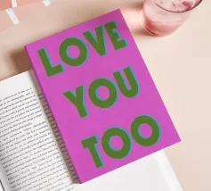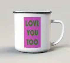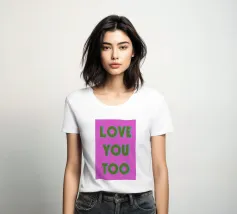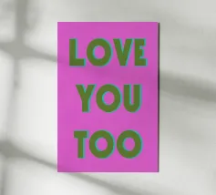 Un'illustrazione moderna e creativa dai vivaci colori verde-viola esprime il messaggio "Love You Too" a grandi lettere e celebra l'amore e la fiducia tra le persone. Perfetta per occasioni romantiche come i matrimoni!