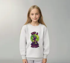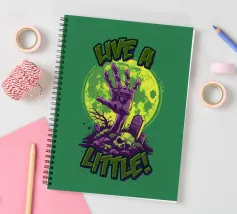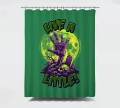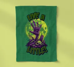 Illustrazione di una mano di zombie che emerge dalla tomba di notte, sullo sfondo di una luna piena incandescente, di una spettrale lapide e di un teschio decaduto. Le audaci tonalità verdi e viola creano un disegno inquietante, ispirato ad Halloween.