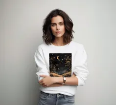 Accattivante paesaggio celeste fantasy del cielo notturno con luna e stelle splendenti e onde fluide ingioiellate con gemme e perle, con effetto metallico nei colori argento e oro, su sfondo nero.