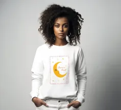 Un design da sogno: una luna pacificamente addormentata con un berretto da notte colorato e a righe, circondato da stelle splendenti. Perfetto per atmosfere accoglienti e sognanti: ideale per le camere dei bambini, per le storie notturne o come motivo calmante per i momenti di relax.
