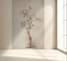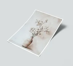 Questa elegante illustrazione mostra un elegante bouquet di erbe delicate e magnolie bianche in un vaso minimalista che si adatta perfettamente allo stile boho. Le morbide tonalità beige pastello e gli elementi botanici conferiscono all'opera un'estetica floreale mediterranea che valorizzerà qualsiasi arredamento domestico.
