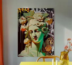 Ispirandosi alla cultura pop e alla street art, trasforma le composizioni in paesaggi visivi freschi e carichi di umorismo. Ogni immagine è una deliberata parodia del mondo dell'arte, ma anche un invito a ripensare il nostro modo di vedere le cose. Qui il classico e il moderno coesistono, l'arte ride di se stessa e lo spettatore viene coinvolto in una storia visiva che non ha bisogno di logica per essere affascinante.