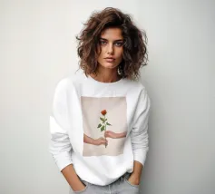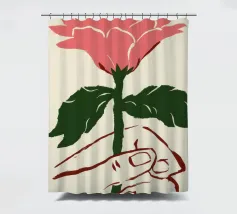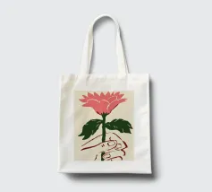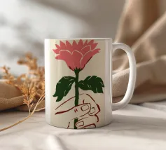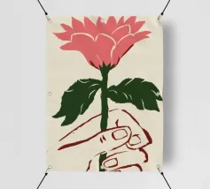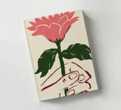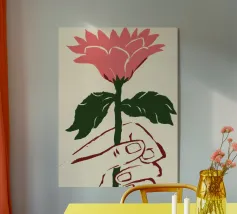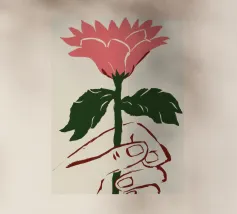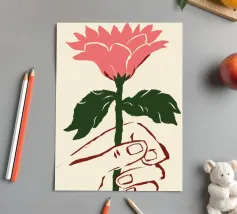 Illustrazione minimalista di una mano che tiene delicatamente un singolo grande fiore rosa. L'immagine simboleggia la fragilità, la bellezza e il legame con la natura.