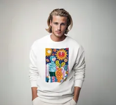 Una vibrante e gioiosa composizione astratta di foglie colorate e forme organiche nello stile dei ritagli di Henri Maraoui. La composizione è dinamica e piena di vita.