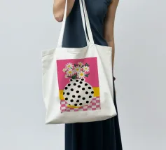 Una natura morta audace e giocosa con un bouquet di margherite bianche in un grande vaso bianco a pois neri. Lo sfondo rosa e il pavimento a scacchi aggiungono un'atmosfera divertente, grafica e modernamente pop art alla composizione.