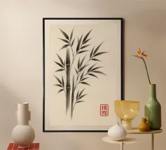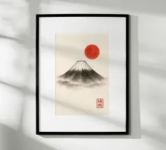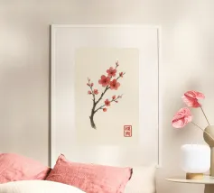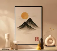 Un'opera d'arte minimalista nello stile delle tradizionali stampe xilografiche giapponesi. Tre margherite stilizzate si ergono erette e fiere su uno sfondo beige. I contorni netti e neri, la tavolozza di colori caldi con i centri dei fiori gialli e il sigillo Inkan rosso nell'angolo conferiscono al motivo un mix armonioso di grazia naturale ed estetica dell'Estremo Oriente. Ideale come decorazione murale per gli amanti del design zen, del Giappone vintage e della grafica floreale.