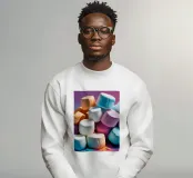 Una varietà di marshmallow colorati sono disposti in modo disordinato, creando una disposizione invitante e giocosa con uno sfondo luminoso e schizzato che esalta l'atmosfera allegra.
