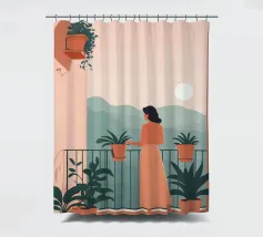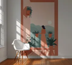Un'edificante scena minimalista di una donna che si prende cura delle sue piante in vaso su un balcone illuminato dal sole. Un'opera calda che celebra le mattine lente e la bellezza dei rituali quotidiani.