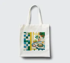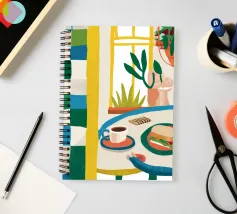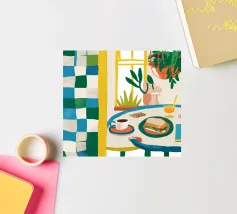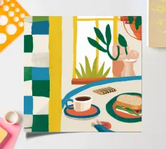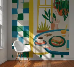 Una deliziosa scena di colazione davanti a una finestra, con caffè e panino su un piatto appoggiato su una tovaglia a scacchi bianchi e blu. La luce del sole entra illuminando il momento accogliente e allegro della mattina.