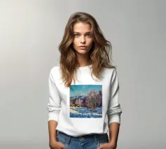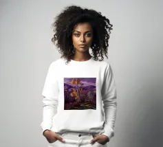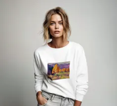 Un dipinto paesaggistico espressivo raffigura un fiume che serpeggia in una valle con alberi dalle tonalità autunnali o crepuscolari di rosa, arancione e viola, sotto un cielo drammatico e colorato, che evoca una scena lunatica e vibrante.