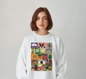 Un motivo allegro e giocoso di varie icone simpatiche e colorate, tra cui arcobaleni, cactus, occhi e frutta. Il mix eclettico crea un disegno divertente, energico e stravagante.