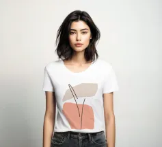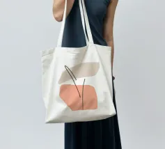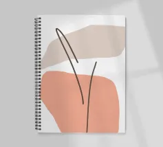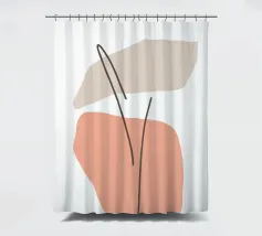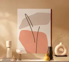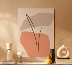 Le forme astratte sono protagoniste di colori tenui, come il pesca e il beige. Sottili linee nere si intersecano, aggiungendo un senso di movimento ed equilibrio.