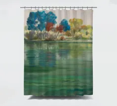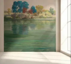 Alberi colorati si riflettono sull'acqua color smeraldo, creando un mondo fluttuante e onirico di armonia e luce.