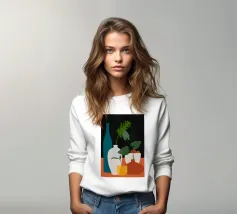 Una moderna natura morta astratta con una pianta stilizzata in un vaso blu, un croissant e forme organiche sotto un sole giallo, il tutto in una composizione equilibrata e calda.