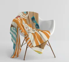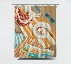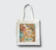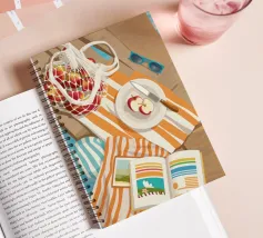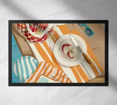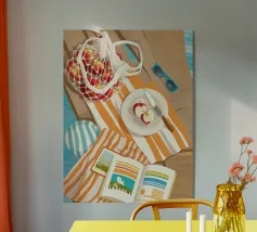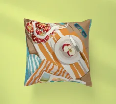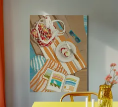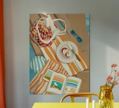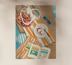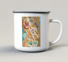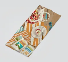 Una vista a volo d'uccello di un'accogliente sistemazione mattutina con caffè, croissant, un libro e bicchieri su una tovaglia a righe. L'illustrazione cattura i rituali pacifici e piacevoli di una mattinata tranquilla.