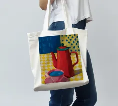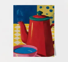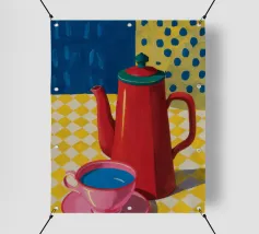 Il classico momento del caffè viene immortalato con un'alta caffettiera rossa e una tazza rosa su una tovaglia a scacchi gialla e bianca, su uno sfondo blu intenso, creando una scena accogliente e colorata.