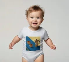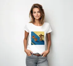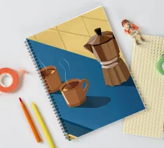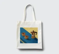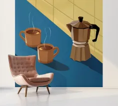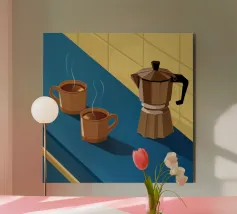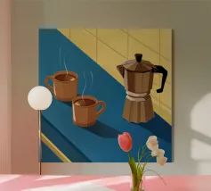 Una classica caffettiera e due tazze fumanti di caffè sono illustrate su uno sfondo bicolore, che cattura il semplice, confortante ed essenziale rituale del caffè mattutino.