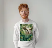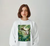 Un'affascinante scena di una mamma gufo che coccola il suo piccolo in una vivace giungla tropicale. Questo dolce disegno faunistico dona calore e un delicato tocco di natura a qualsiasi ambiente.