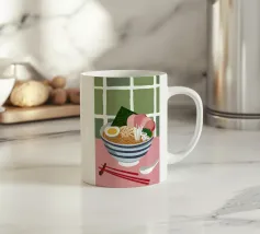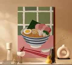 Una confortante ciotola di ramen fumante è illustrata con dettagli meticolosi, dalla lucentezza del brodo all'attento posizionamento dei condimenti. Quest'opera è più di un semplice cibo: è una celebrazione del comfort, del calore e dell'arte rilassante di un pasto ben fatto.