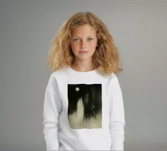 Una scena sfocata e monocromatica evoca un senso di mistero con un elemento circolare luminoso in alto a sinistra, che forse suggerisce una luna. Le striature e le macchie verticali creano un'atmosfera spettrale ed eterea.