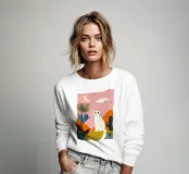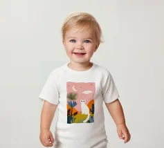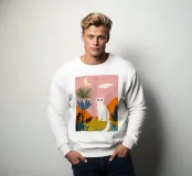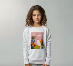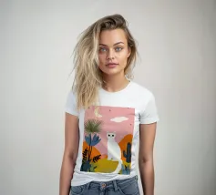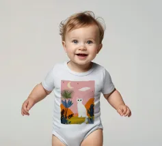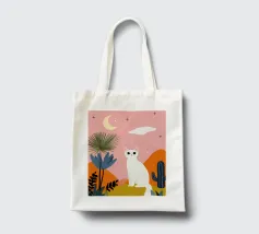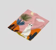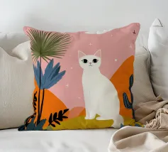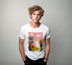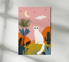 Illustrazione di un gatto sognante sotto una luna crescente con piante del deserto e accenti stellati. I colori pastello e i toni caldi creano un'atmosfera calma e giocosa, perfetta per gli amanti dei gatti che amano l'arte boho moderna e stravagante. Aggiunge un po' di magia, serenità e fascino alla vita quotidiana.