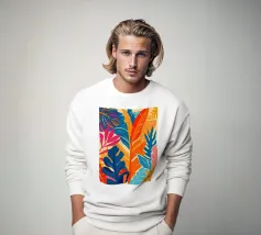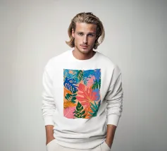 Un motivo ripetuto di monstera stilizzata e altre foglie tropicali è presentato in una tavolozza di colori retrò di giallo senape, marrone, verde acqua e ruggine, creando un mosaico botanico elegante e nostalgico.