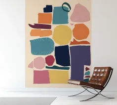 Quest'opera d'arte è un allegro collage di forme astratte tagliate a mano in una tavolozza vibrante. Le forme blu cobalto, verde acqua, giallo e terracotta si sovrappongono e interagiscono, creando una composizione dinamica che sembra giocosa, energica e ricorda le opere di Maraoui.