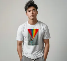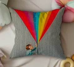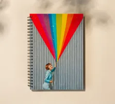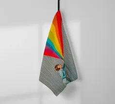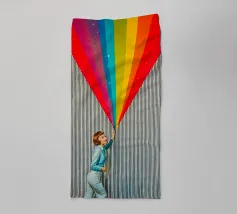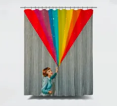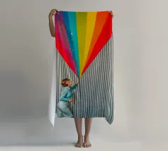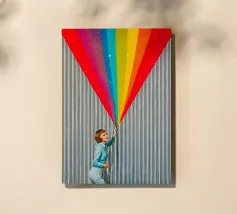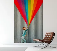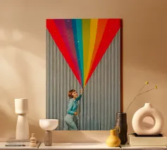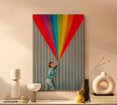 Tuffatevi nel mondo dell'intrigo artistico con questa splendida e dinamica opera da parete che invita alla curiosità e alla creatività. L'opera raffigura una donna in stile retrò, vestita di azzurro, che compie un gesto audace e sembra tagliare il tessuto di uno sfondo neutro a righe, rivelando una straordinaria cascata di colori dell'arcobaleno. L'arcobaleno, cosparso di scintillanti accenti stellari, esplode come se fosse scoperto, aggiungendo un'inaspettata nota di colore e di estrosità a qualsiasi ambiente.