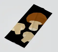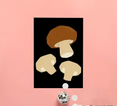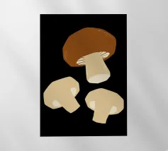 Tre funghi stilizzati si stagliano su uno sfondo nero, con uno che mostra la sua parte inferiore. L'uso di forme semplici e audaci e di colori piatti crea un design moderno e minimalista.
