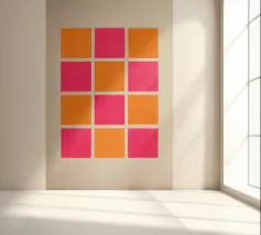 Questa moderna opera d'arte a griglia gioca con la ripetizione, il ritmo e il colore: nove quadrati in rosa e arancione brillante formano una poesia geometrica a colori. La composizione appare chiara e vivace allo stesso tempo, ideale per interni moderni, studi creativi o pareti di gallerie d'arte con un atteggiamento pop. Una dichiarazione di colore, forma e ordine con energia.