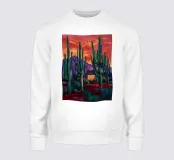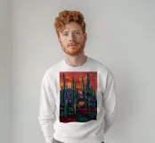 Alti cactus si ergono come sculture contro un cielo drammatico, rosso fuoco e viola intenso, creando una scena del deserto potente e lunatica che sembra allo stesso tempo surreale e intensamente bella.
