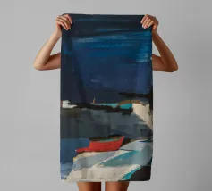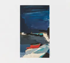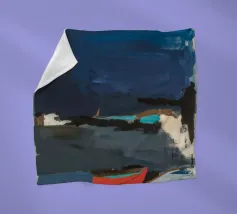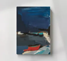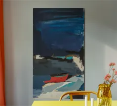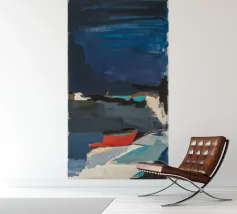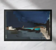 Un dipinto astratto minimalista caratterizzato da un campo dominante di blu profondo e sereno con un sottile bianco e accenni di arancione/marrone, disposto in una composizione prevalentemente orizzontale che suggerisce un orizzonte tranquillo.