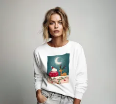 Allegra illustrazione con un orso e un cervo che indossano abiti natalizi accanto a un albero di Natale, irradiando allegria e felicità nel giorno di Natale.