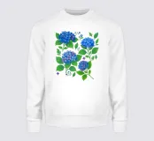 Grazioso motivo floreale con fiori di ortensia blu, rigogliosi e vivaci, con foglie verdi, su uno sfondo azzurro.