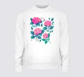 Grazioso motivo floreale con fiori di ortensia rosa fucsia e foglie verdi su sfondo bianco.